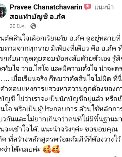 ทุกท่านอาจรู้สึกว่าทํางานบัญชีมานาน แต่ทํางานด้านเดียวไม่มีประสบการณ์ด้านอื่นเลย หรืออยู่ในองค์กรแต่ไม่มีคนสอนงานให้เข้าใจได้ จึงอยากหาความรู้เพิ่มขึ้น อยากเข้าใจบัญชีทั้งระบบ และจัดทําบัญชีปิดงบการเงินได้อย่างมืออาชีพด้วยตัวเอง ต้องการความเจริญก้าวหน้า พร้อมเลื่อนตําแหน่ง พร้อมอัพเงินเดือนได้เลย -